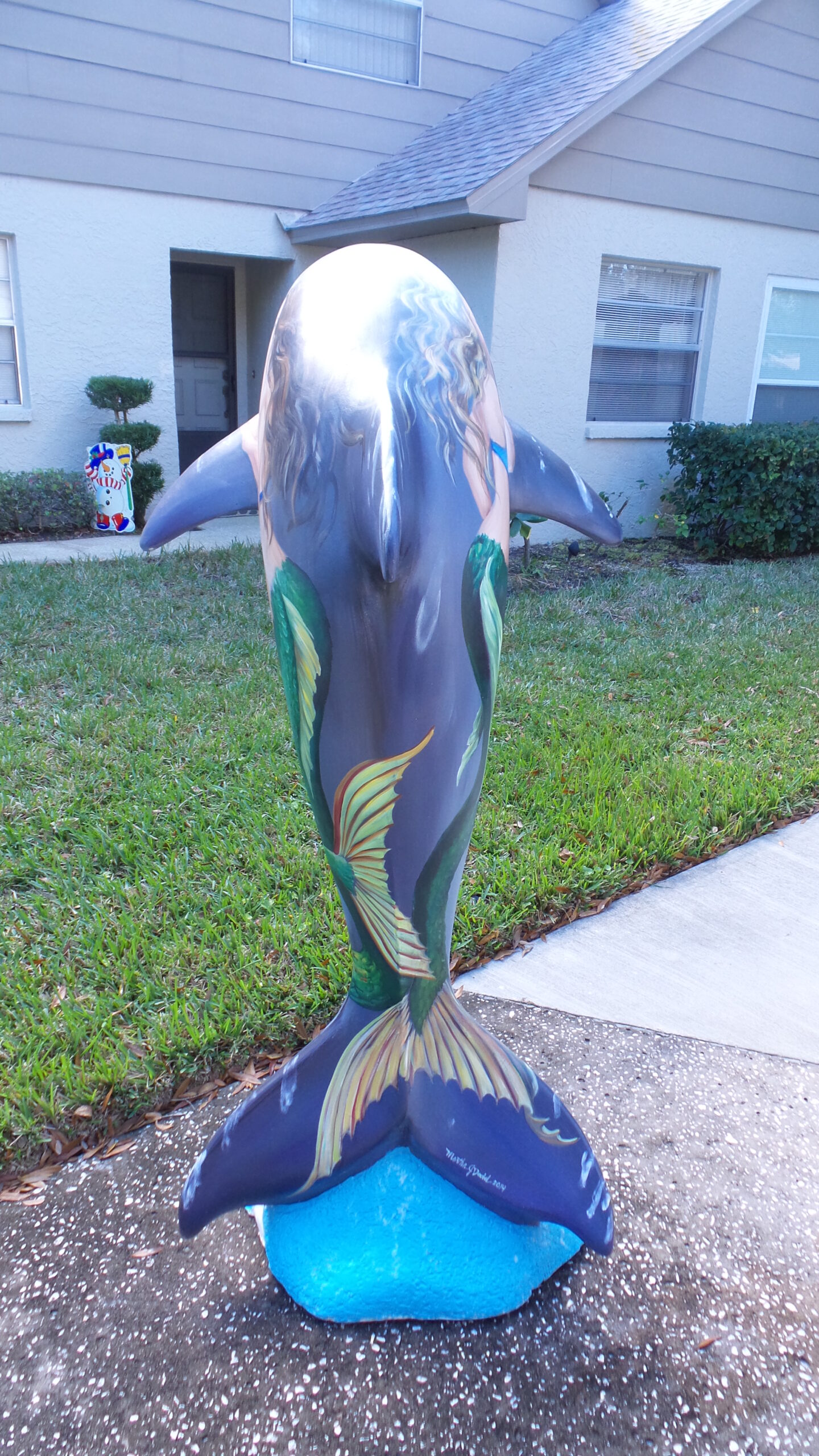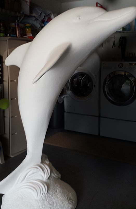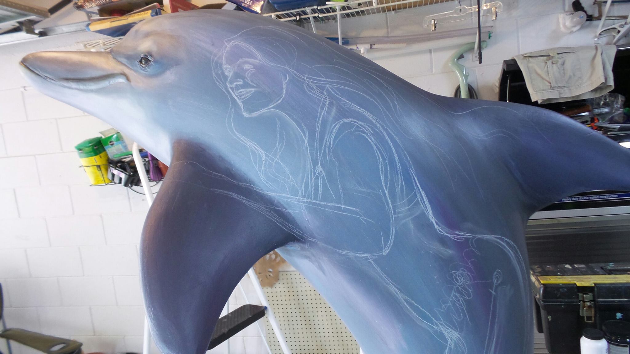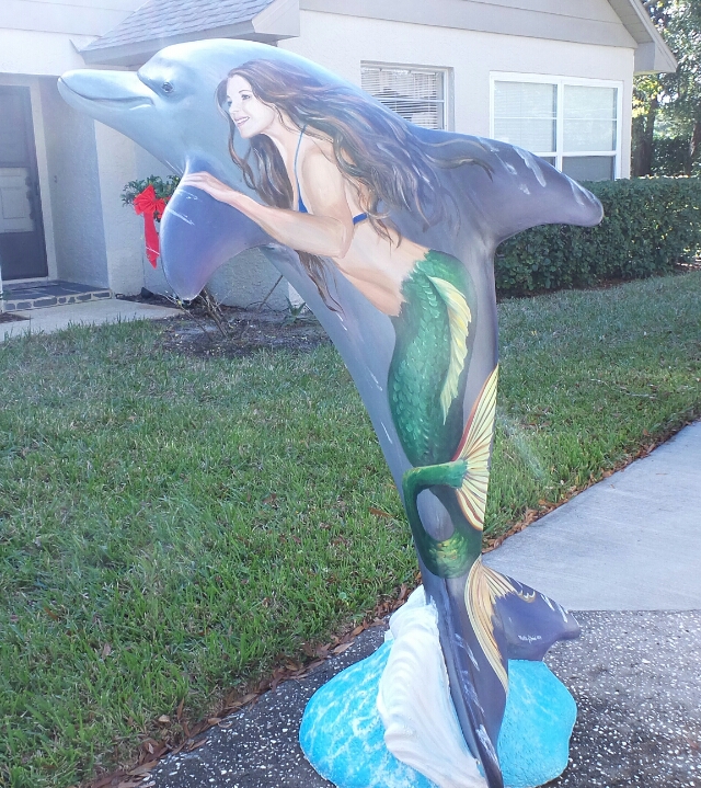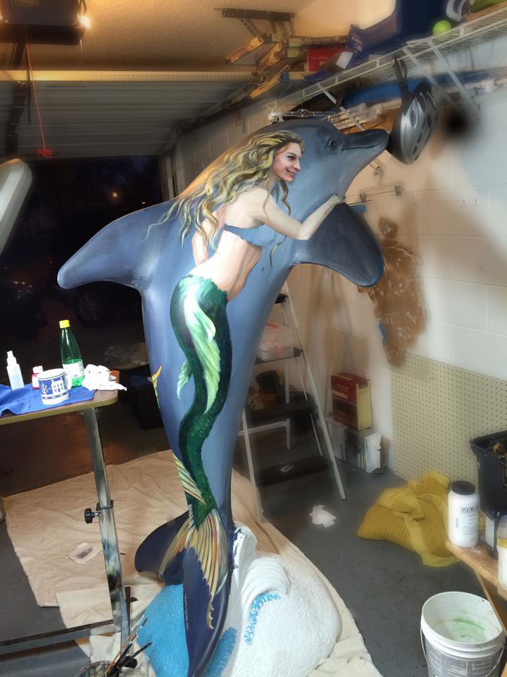 The Clearwater Dolphins Trail is a joint promotion between the Clearwater Regional Chamber of Commerce and the City of Clearwater. I have been commissioned to design a dolphin in this series to be displayed on Clearwater Beach’s Pier 60. Here are some pictures that show how to paint a fiberglass sculpture. First I cleaned and sanded the sculpture, touching up with primer, any areas where the primer had scraped off. The next step was painting the dolphin himself, in natural colors, which is my style. I used artist acrylics, mainly Faux Effects, Golden and Liquitex. When the dolphin was good and dry, I sketched the mermaids on using soapstone marking sticks. These sticks leaving marks that easily wipe away, and show well on a dark surface. On a light surface I would recommend willow charcoal instead.