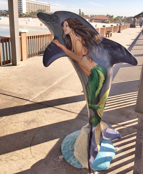 Then I painted in my mermaids, using photos of models that I took as references. The idea was that the mermaids appear to swim alongside the dolphin. I finished the painting with the logo for Pier 60.