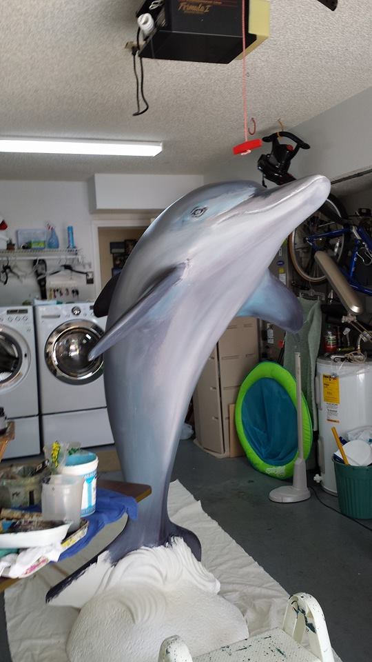 Lastly, I varnished the dolphin with Colorseal from Faux Effects as a barrier coat. A barrier coat protects the artist paints from the potential of the more aggresive sealer to follow, from damaging the work. I followed that with 3 coats of Plex Seal, sold by Porter Paints.